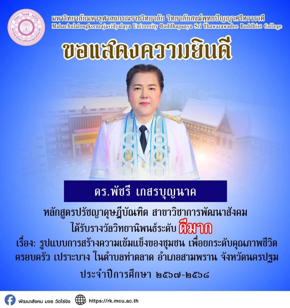 หลักสูตรบัณฑิตศึกษา สาขาวิชาการพัฒนาสังคม นำโดย 🙏 พระมหาประกาศิต สิริเมโธ ผศ.ดร. ผู้อำนวยการหลักสูตร และ ดร.สัญญา สดประเสริฐ อาจารย์ประจำหลักสูตร ได้รับมอบหมายจาก 🙏 พระครูปลัดประวิทย์ วรธมฺโม ผศ.ดร. ผู้อำนวยการวิทยาลัยสงฆ์พุทธปัญญาศรีทวารวดี นำนิสิตระดับบัณฑิตศึกษาเข้าร่วมจัด 📚 นิทรรศการแสดงผลงานทางวิชาการ เนื่องในงาน 🎉 ครบรอบ 38 ปี บัณฑิตวิทยาลัย มหาวิทยาลัยมหาจุฬาลงกรณราชวิทยาลัย